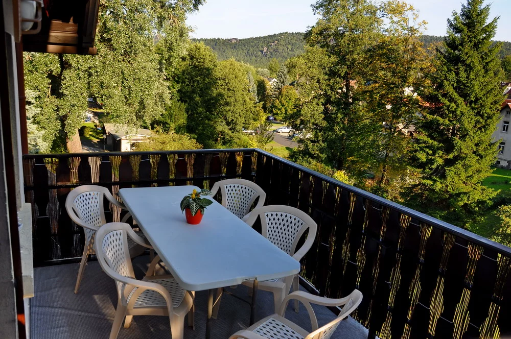 Terasse. Sie lädt zum Frühstück über den Dächern der Hölle,